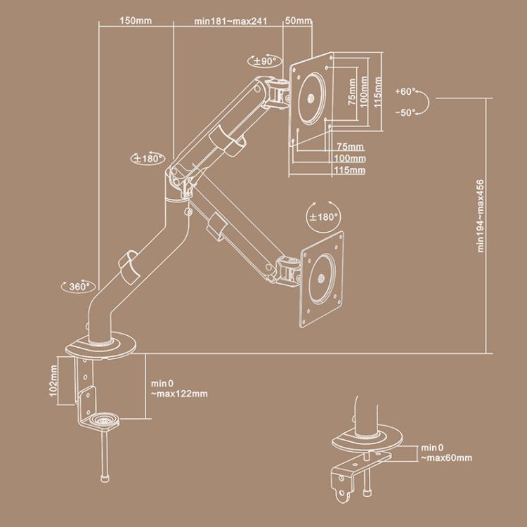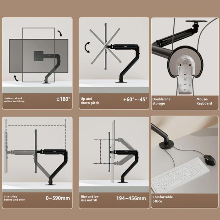 3. 90 grādu slīpuma regulēšana: slīpuma leņķa diapazons uz augšu/uz leju no +60 līdz -45 grādiem. Priekšējā/aizmugurējā pagarinājuma diapazons: 0–590 mm. Augstuma regulēšana: 194–456 mm. Pārslēgšanās starp horizontālu un vertikālu ekrānu pilna leņķa vadībai ar vienu klikšķi!