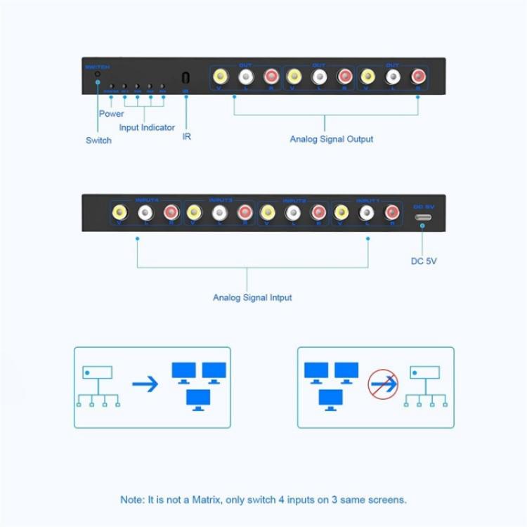 RCA 4 In 3 Out AV Audio Video Signal Composite Switcher AV Switch Splitter Box