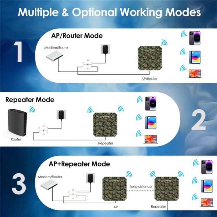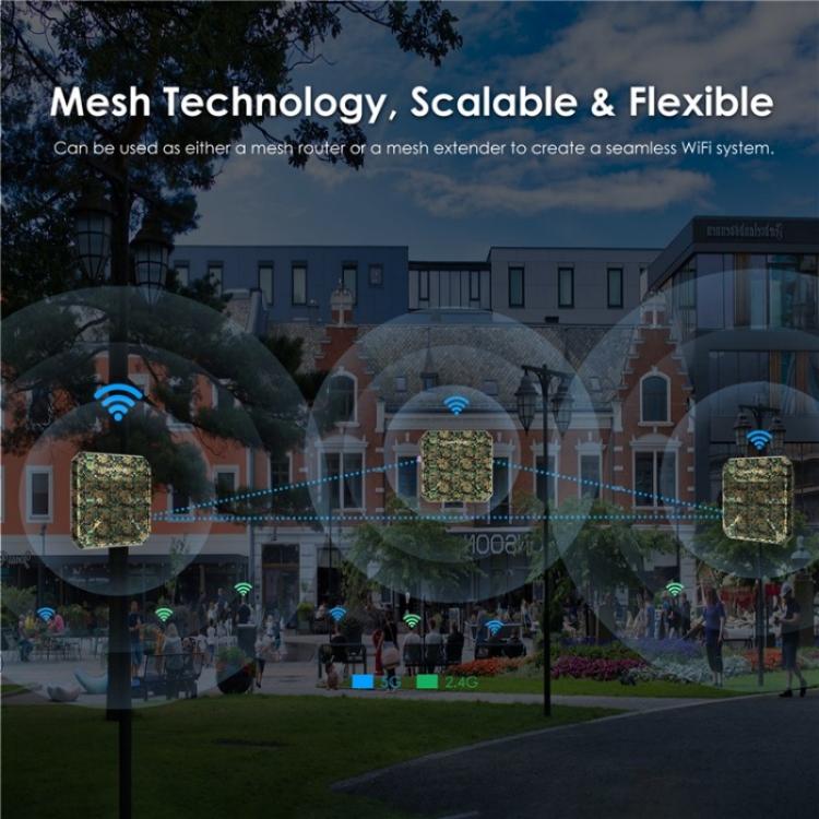 5. Paplašināta uzticamība lietošanai ārpus telpām: ar maskēšanās krāsu dizainu šis WiFi maršrutētājs ir ideāli piemērots lietošanai ārpus telpām garāžās, pagalmos un kemperos.