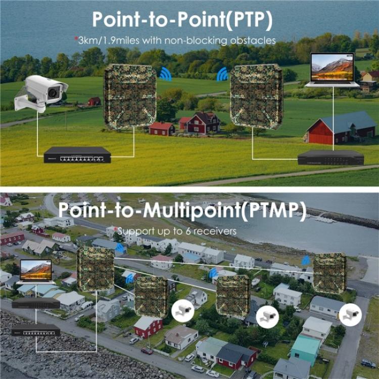 2. Iebūvēta 12dBi virziena antena: 4 iebūvētas 12dBi virziena antenas (2 x 12dBi 2,4 GHz antenas; 2 x 12dBi 5 GHz antenas), lai sasniegtu 300 metru stabilu virziena bezvadu pārklājumu. Tas var ievērojami uzlabot bezvadu signālu pārraides un uztveršanas veiktspēju. Piezīme. Vairāk nekā 3 km/1,9 jūdzes (tikai pārraidei pārī PtP vai PtMP) ir pārbaudīts pieejamā laukā. Lūdzu, izvairieties no šķēršļiem starp POE ierīci un mērķa zonu, pretējā gadījumā veiktspēja būs ievērojami ierobežota.