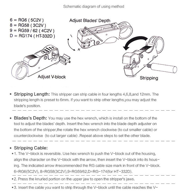 7. Operation: align the end of the cable to be stripped with the end of the stripper, turn it clockwise a few times, and then remove the cable. when stripping the -7 cable, you need to use an allen key to adjust the blade depth
