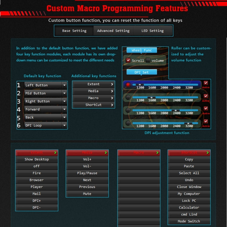 4. Adjustable DPI Switch: 1200-1600-2000-2400-3200 DPI.
