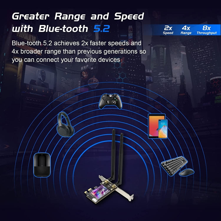 2.RTL8852 Chip : The newest upgrade chip supports AX1800Mbps Wi-Fi speeds & Bluetooth 5.2 function; Band 5.8GHz up to 1200Mbps, Band 2.4GHz up to 574Mbps , the best choice for desktop PC for online gaming and 4K Ultra HD video streaming