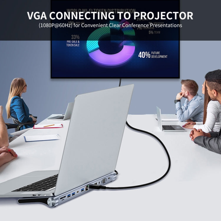 1. Extensive capability: 12 in 1 USB Type-C hub includes 1*Micro SD card reader, 1*TF card reader,1*USB 3.0 Ports, 2*USB 2.0 ports,1*Type-C PD charging port,1*USB C transfer port, 2*4K HDMI video output,1*VGA video output,1*3.5mm audio port,1*RJ45 ethernet port.