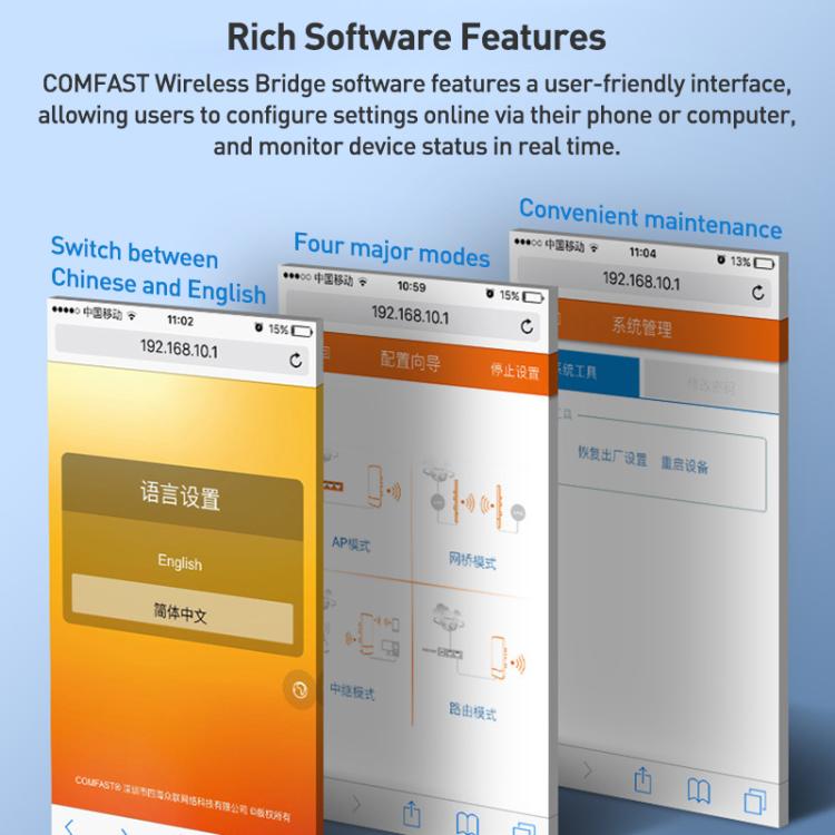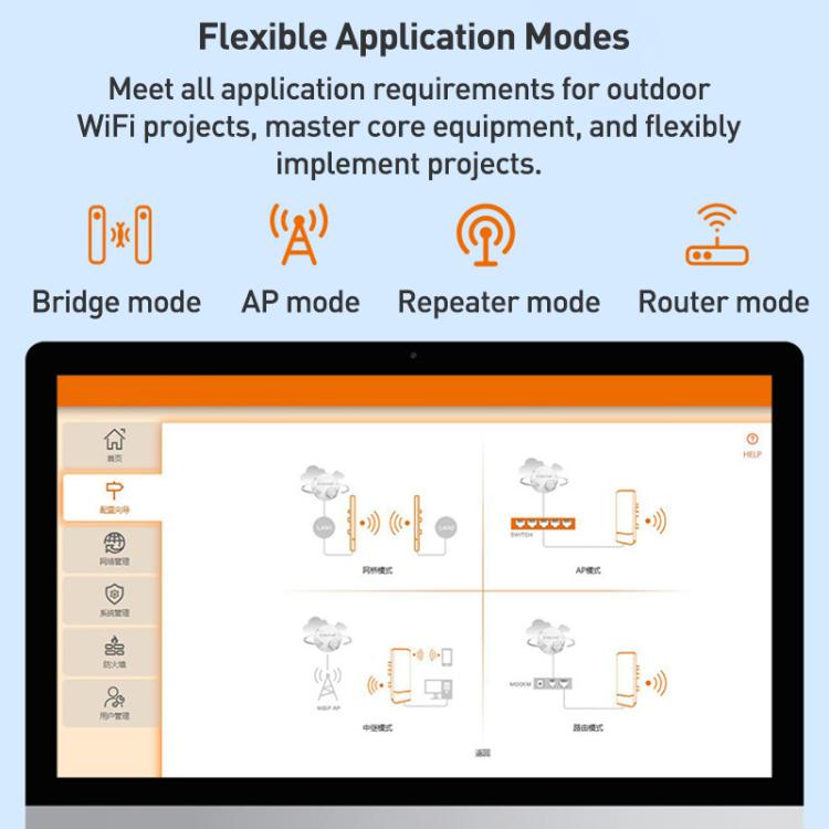 6. Различные режимы для гибкого применения: отвечают всем требованиям к применению проектов наружного WiFi, позволяя вам освоить основное оборудование и гибко реализовывать проекты.