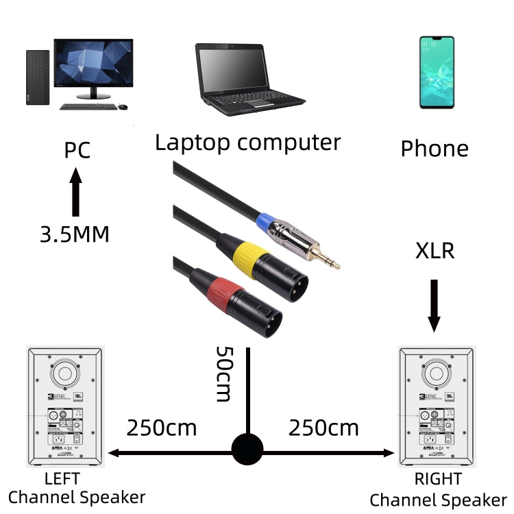 2. Конец провода с 3,5-мм разъёмом находится на расстоянии 50 см от разъёма, а длина от конца Canon до разъёма составляет 250 см. При подключении одноканального активного монитора динамики могут быть разнесены на 5 метров.